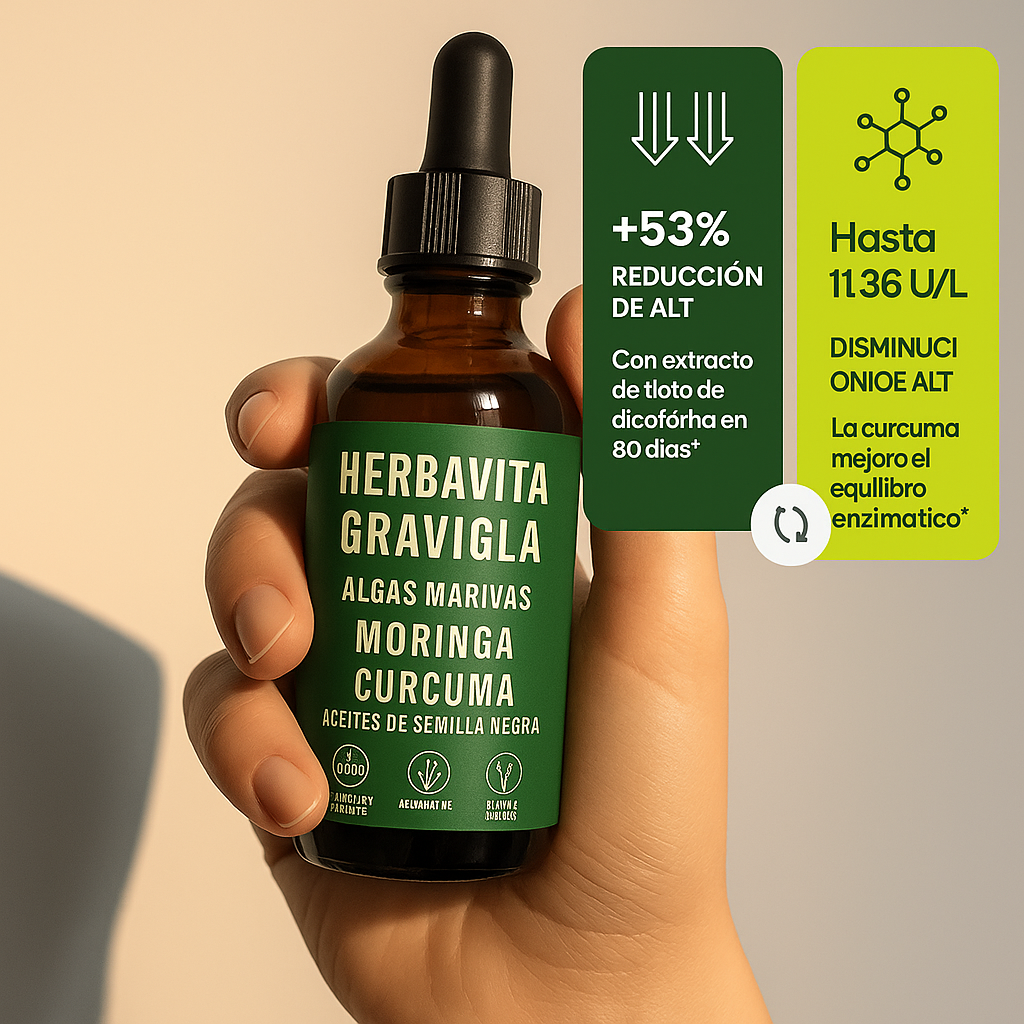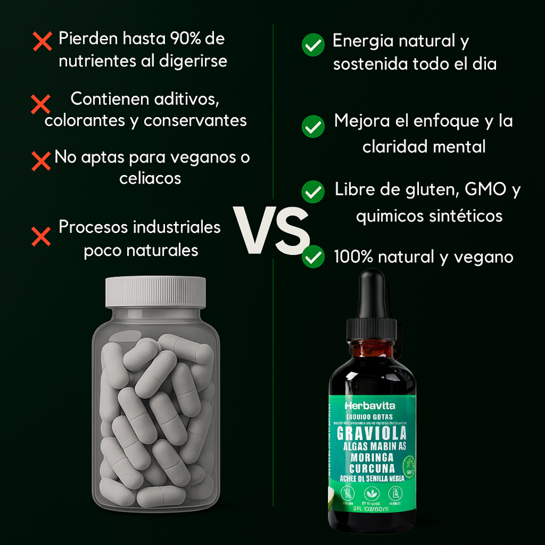 Herbavita 10-en-1 combina 10 superalimentos naturales en un solo gotero líquido que restaura tu energía, mejora la digestión y reduce el estrés
